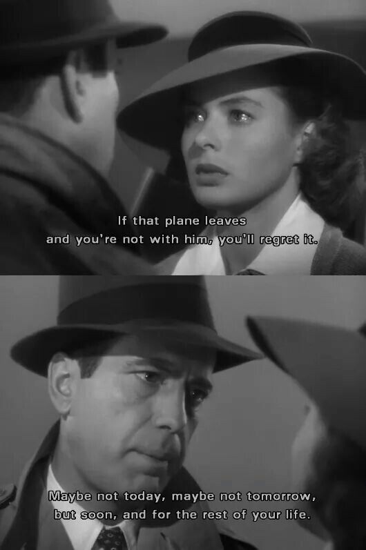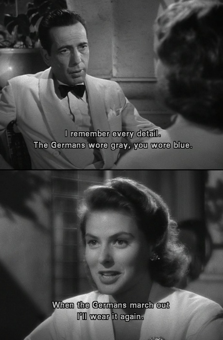 Casablanca es el purgatorio donde sale cada día el ansiado avión que llevará a cientos de almas que huyen del horror de la Segunda Guerra Mundial hasta Lisboa y, de ahí, a la libertad. Mientras, todos esperan en la ciudad hasta que llegue su momento. El Café de Rick es el negocio más exitoso de Casablanca porque en en ese microuniverso de almas desesperadas todo puede suceder. Una prueba de dignidad y esperanza. Los aliados han ganado la guerra (o al menos una batalla importante) cuando todos cantan al unísono la Marsellesa ante la tropa del mayor Strasser, aunque hay derrotas que son todavía dolorosas. «Sam, te dije que no la volvieras a tocar más», dice Rick a antes de encontrarse de nuevo con Ilsa. As Time Goes By. Ese recuerdo no está permitido en Casablanca. El dolor de un amor perdido se queda en la línea del frente, no en la retaguardia del éxito.
